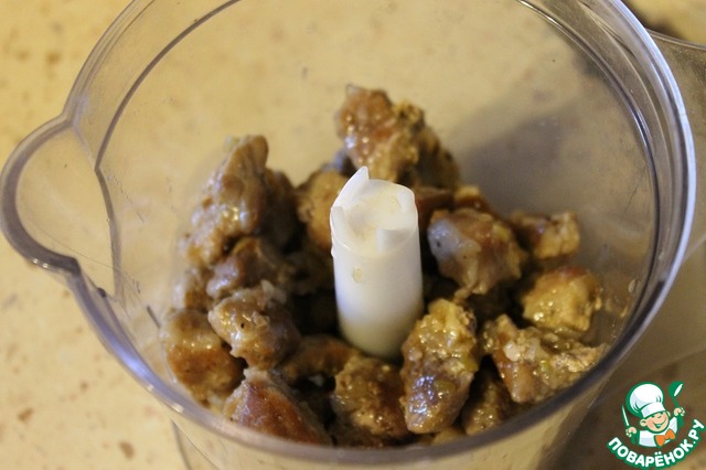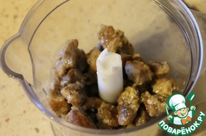 Кусочки тушеной свинины сложить в блендер и измельчить, не сильно.