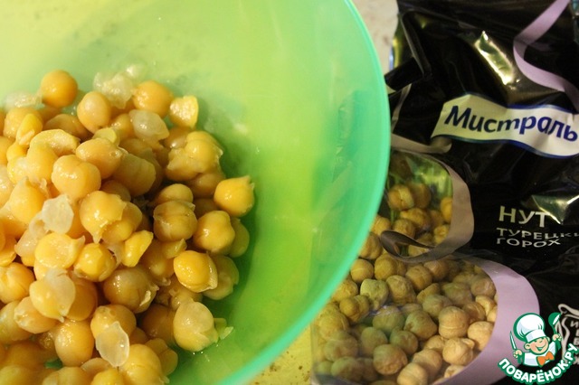Вареный нут измельчить до состояния пюре, погружным блендером. При необходимости добавить пару ложек воды, в которой парился нут, посолить и поперчить по вкусу.