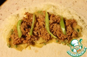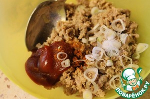 В измельченное мясо добавить кетчуп, перец чили и белую часть зеленого лука нарезанного кольцами.