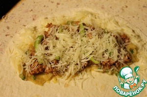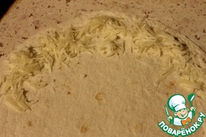 Лепешку обрезать, если нужно по диаметру сковороды. На половину лепешки по краю, выложить сыр.