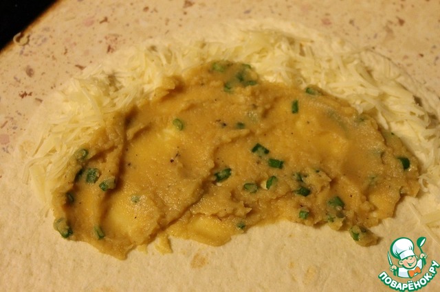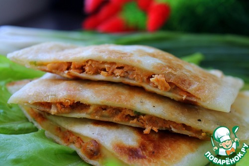 Присыпать сверху сыром. Накрыть пустой половиной лепешки и перенести на разогретую сковороду с растительным и сливочным маслом. Обжарить с двух сторон, до легкой золотистости.