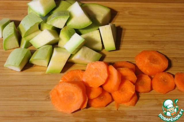 • Кабачок нарезать крупными кусочками, морковь кружочками.