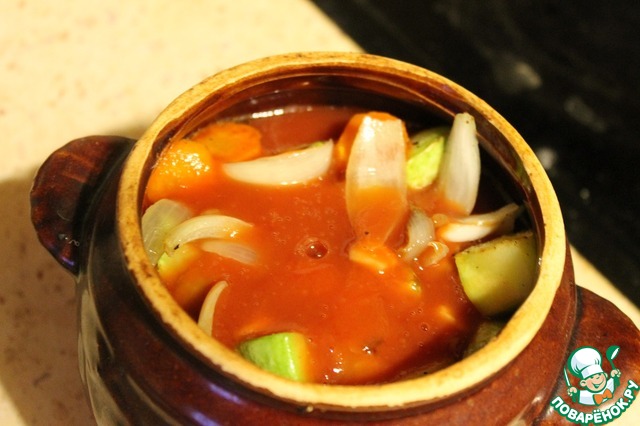 • Залить томатным соком, слегка посолить. И отправить в заранее разогретую до 190 градусов духовку на 30 минут.