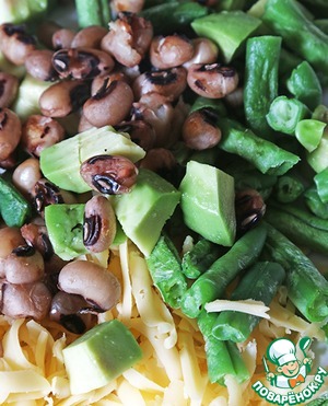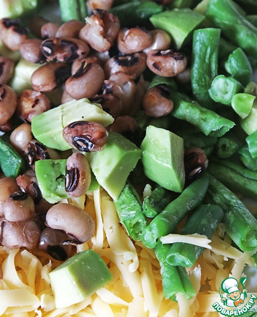 • Теперь мы натираем сыр на крупной терке, размораживаем стручковую фасоль (или режем, если вдруг свежая), режем кубиками авокадо, и все это смешиваем с фасолью.