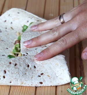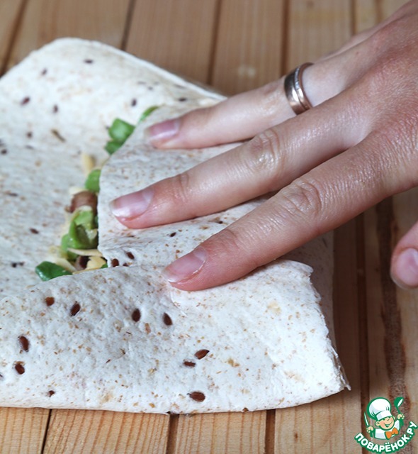 • Складываем одну длинную сторону лепешки, за тем сверху две короткие, переворачиваем на вторую длинную сторону и обжариваем на малом огне на сководе-гриль по несколько минут.