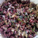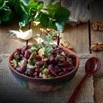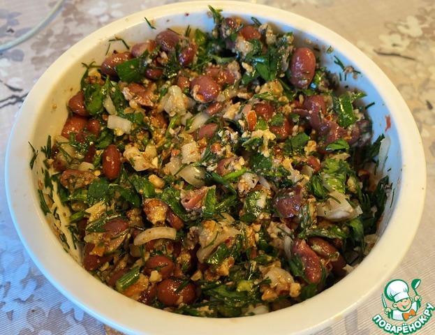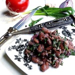 В середине 80-х годов этот салат был у нас частым гостем на праздничных посиделках на работе (тогда не было слова "корпоратив "), и этот салат делал наш сотрудник. Улетал он у нас с тарелок очень быстро. В моей кулинарной тетрадке этот рецепт записан под названием "Лобио" - под таким названием и оставляю.