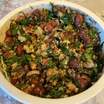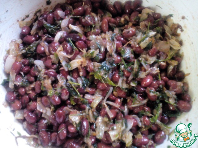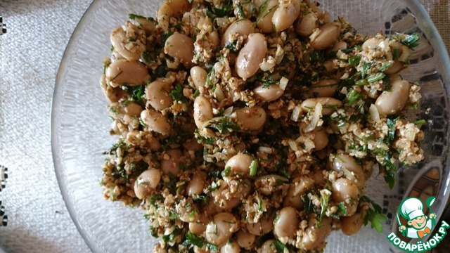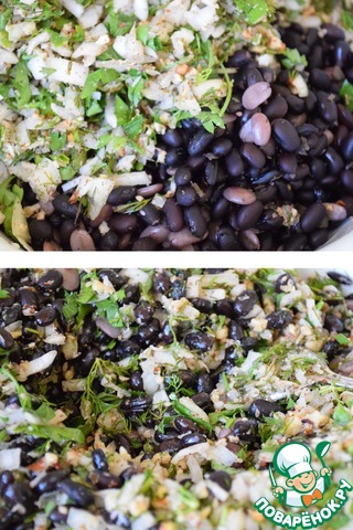 Добавить фасоль к вышеприготовленной смеси, при необходимости добавить соль и специи, растительное масло, хорошо перемешать и убрать в холодильник на 1 час.
