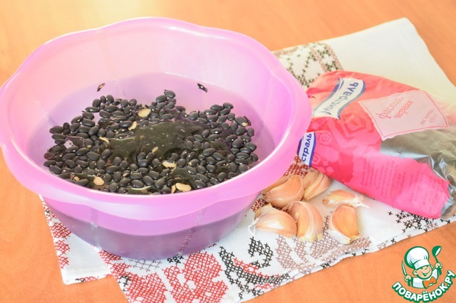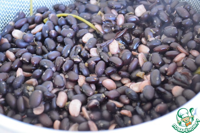 Фасоль (я брала черную фасоль ТМ "Мистраль") хорошо промыть и залить на ночь водой (или часа на 3-5). Затем поставить варить фасоль в соленой воде с добавлением укропа и петрушки (несколько веточек)