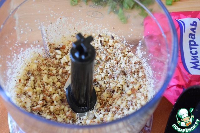 Орехи порубить ножом или перемолоть в блендере (не в порошок, а чтобы остались кусочки)