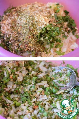 Сложить в чашку лук, орехи, чеснок, зелень, соль, перец и обязательно сухую аджику. Хорошо все помять руками и убрать минут на 30-40 настояться.