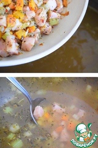 Затем добавляем содержимое сквороды, перемешиваем и варим еще минут 5-10.