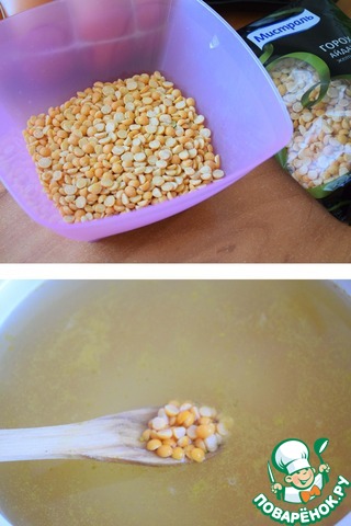 Горох (я использовала колотый горох ТМ "Мистраль" (его не надо замачивать) хорошо промыть, залить бульоном, посолить (если бульон не соленый) и варить на медленном огне 40-50 мин.