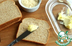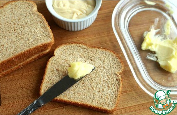 Теперь берём хлеб, с одной стороны смазать сливочным маслом,