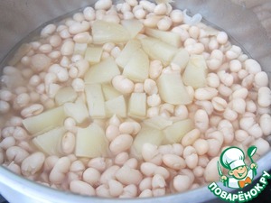 Картошку нарезать брусочками и готовить вместе с фасолью минут 10. Ее можно и не добавлять, но в таком случае часть фасоли стоит размять в пюре. -