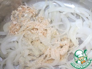 Всыпать растертый сушеный корень петрушки или пастернака и немного обжарить вместе. -