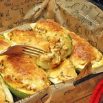 Выкладываем фарш в подготовленные лодочки, так, чтобы он не выпирал из них. Сверху выкладываем сырную массу.
