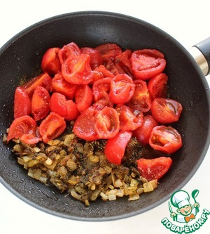К луку и чесноку добавьте все специи, перемешайте, будет потрясающий аромат. Добавьте нарезанные помидоры и 2 ст. л. кетчупа, прогрейте все несколько минут. По необходимости добавьте бульон или горячую воду.