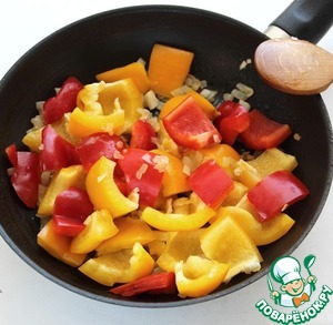 В другой сковороде на растительном масле обжарьте оставшийся лук и чеснок до прозрачности, добавьте нарезанный перец, обжарьте все вместе, затем добавьте бульон и потушите под крышкой.