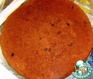 Время приготовления указано без учета времени застывания торта. Приготовить бисквит: Яйца взбить с сахаром в крепкую пену, добавить муку, смешанную с какао. Вылить в форму (диаметром 22 см), застеленную пергаментом. Выпекать при 180*C до готовности.