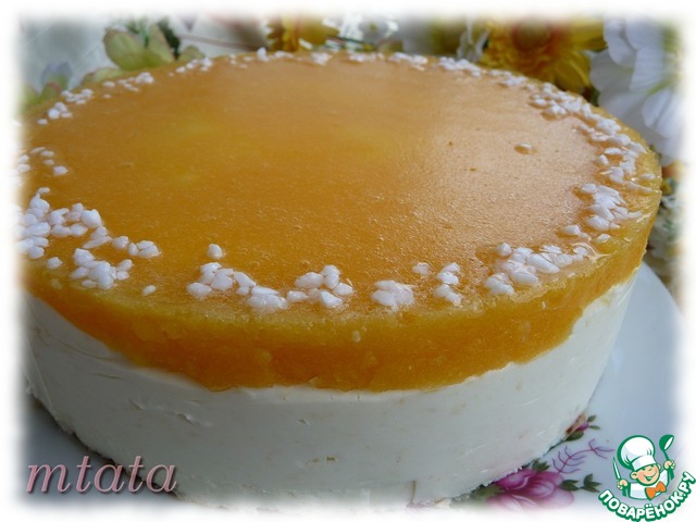 Тем временем приготовить заливку. Желатин замочить в 20 г холодной кипяченой воды. Пюре манго и сахарную пудру смешать и добавить растопленный желатин.