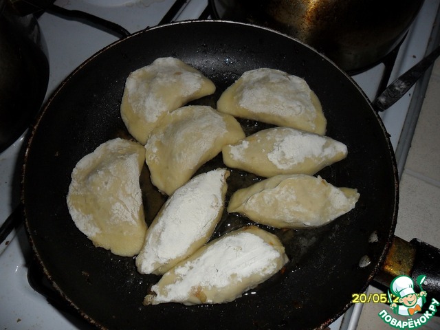 Обжариваем на среднем огне не жалея подсолнечного масла. Жарятся пирожки довольно быстро. примерно по 3-5 минут с каждой стороны. ( на фото видны два вида оформления пирожков: и в виде пельменей, и в овальной форме)