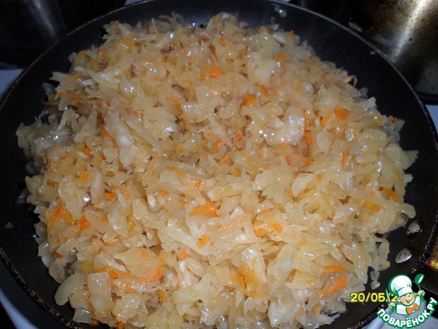 На среднем огне тушим квашенную капусту на подсолнечном масле примерно минут 40. Капуста должна стать золотисто-коричневого цвета.