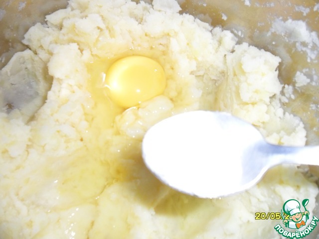 После того как картофель сварился, сливаем воду, остужаем и затем с помощью толкушки делаем пюре. Добавляем яйца и соду. Внимание, соду гасить не надо! не знаю, какую роль она там играет, но мама всегда делала с содой и я ее убирать не стала. Хорошенько все протираем, чтоб не было комков все той же толкушкой. Никаких мясорубок и блендеров не надо.