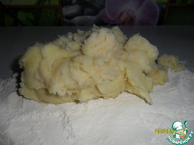 На рабочую поверхность высыпаем сначала один стакан муки и выкладываем картофель. и начинаем замешивать тесто. тесто возьмет столько муки сколько надо. готовность теста можно определить легко. Оно мягкое и не рассыпчатое. если рассыпается, то нужно еще добавить муки