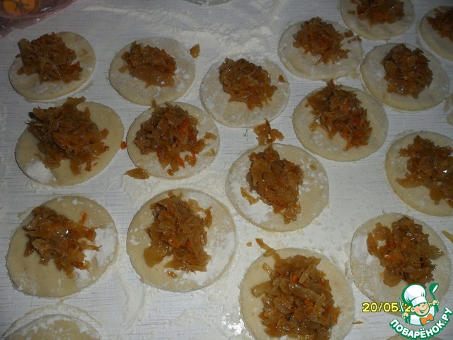 Аккуратно раскладываем начинку. НО перед эти желательно все кружочки поднять, просто некоторые, возможно, прилипли к столу.