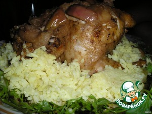 • В духовку, нагретую до 200 градусов, на 30-40 минут в рукаве. Потом осторожно с одной стороны открываем рукав и даём курочке порумяниться 10-15 минут при такой же температуре. Выкладываем на блюдо. В ароматную куриную юшечку вкусно положить отваренного риса. Минуты 3 - и рис наберётся куриных ароматов. Яблоки внутри курочки более упругие, и выгодно дополняют куриный ансамбль.