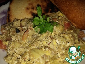 Вбиваем в сковороду яйца и перемешиваем с овощами, делаем так пока яйца не прихватятся от температуры... Вот как это выглядит...