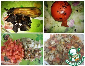Баклажаны обжигаем до корочки, помидор слегка (только, чтоб лопнула шкурка). Овощи складываем в пакет на 3-5 мин.