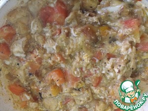 Очищаем овощи от кожицы и режем кубиком 1х1 см. В сковороде раскаляем масло, закладываем туда овощи и чеснок (его можно пропустить через пресс, а можно и мелко порезать, кто как любит), так же добавляем соль и перец, перемешиваем и оставляем томиться минут на 5. Когда помидоры распустились можно приступать к следующему шагу...