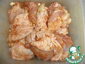 Вылить маринад в курицу, хорошенько перемешать. Накрыть крышкой или пищевой пленкой, поставить в холодильник на 2-3 часа.