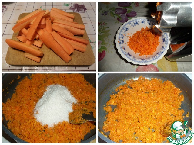 Очищенную морковь нарезаем произвольно. Пропускаем через мясорубку. Обжариваем на растительном масле, добавив 0,5 стакана сахара, 5-7 минут. Остужаем.