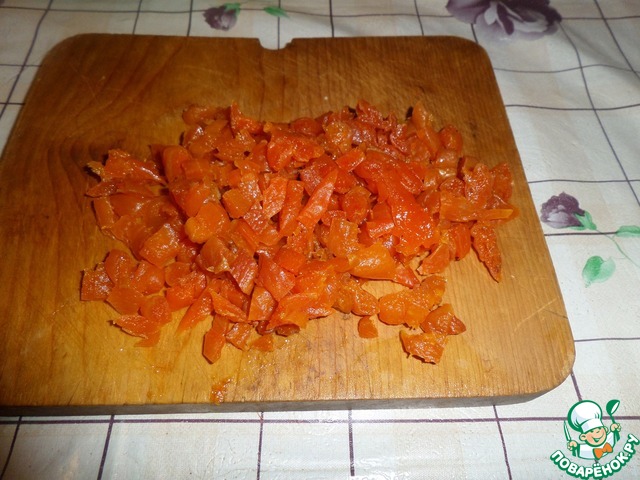 Курагу промываем. Заливаем горячей водой на 10 минут. Нарезаем мелким кубиком.