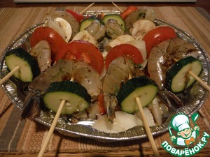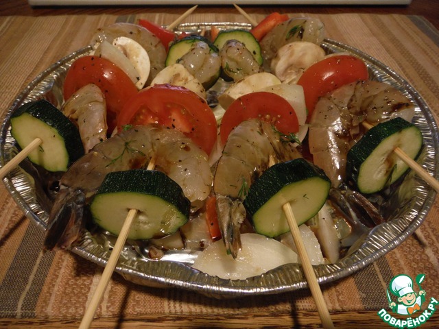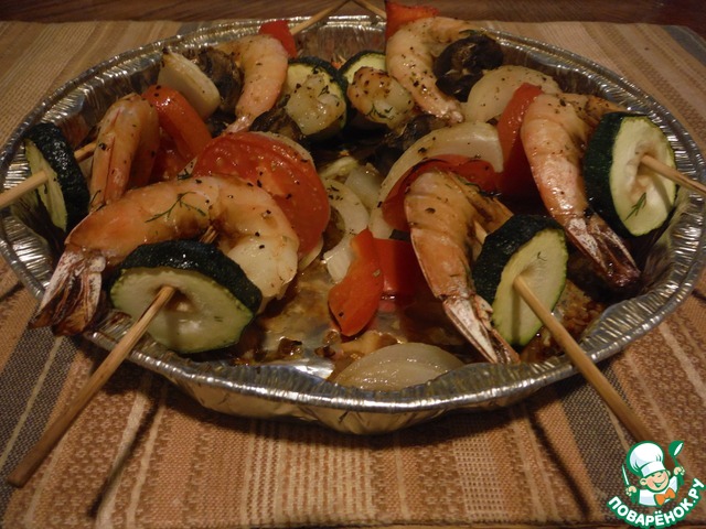 Креветки кладём в миску, перчим, поливаем соевым соусом и оливковым маслом. Соль не нужна, поскольку соус солёный. В отдельную миску режем все овощи, также поливаем соевым соусом и оливковым маслом, перчим. Нанизываем поочерёдно все ингредиенты на шпажки и кладём шашлычки в форму для духовки.