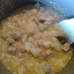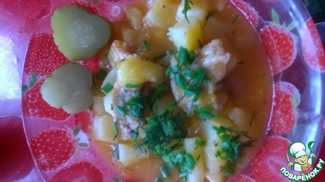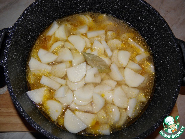 За 5-6 минут до готовности перемешать картофель, отлить чуть бульона и развести в нем муку без комочков. Затем влить обратно в кастрюльку, перемешать и потушить минут 5.