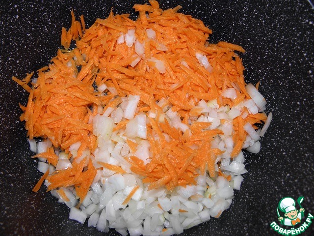 В казан или кастрюлю с керамическим покрытием налить немного масла и слегка обжарить лук и морковь.
