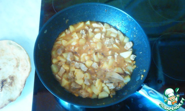 Нарезать картофель (выбирать лучше рассыпчатый), выложить к мясу, долить воды так, чтобы картофель слегка выступал. Добавить лавровый лист.