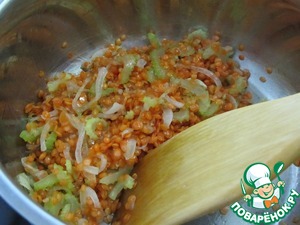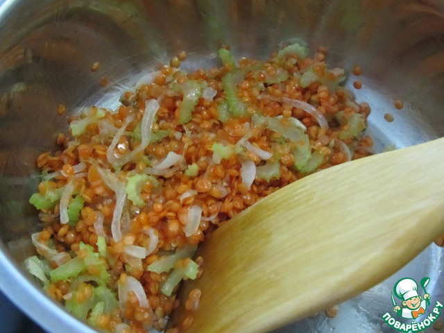 Всыпать подготовленную чечевицу и готовить 1-2 минуты при постоянном помешивании, чтобы она со всех сторон покрылась маслом.