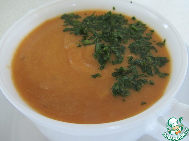 При подаче украсить ярко-оранжевый суп мелко нарезанной зеленью петрушки. Ее все-таки лучше перемешать с супом. И не забыть про лимонный СОК! Без него суп "скучный".