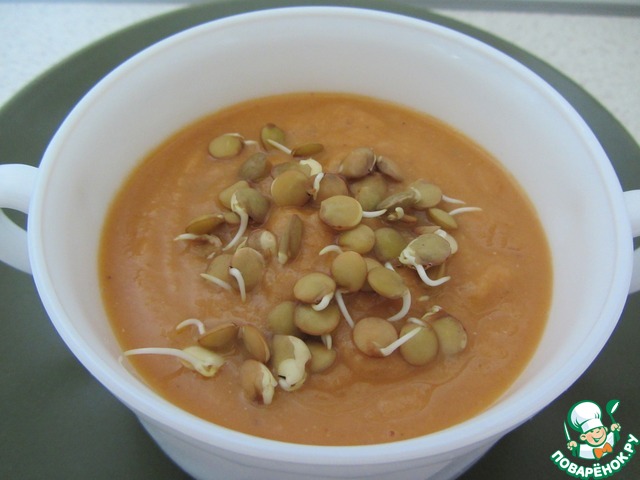 Мне нравится добавлять в приготовленные супы-пюре замороженный зеленый горошек. В этот раз - очень близкая к нему по вкусу пророщенная чечевица.