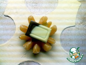 На середину подготовленного теста положить мандарин, в середину положить 0,5 ч.л. мёда, несколько кусочков мармелада (предварительно порезанного) и кусочек шоколада.