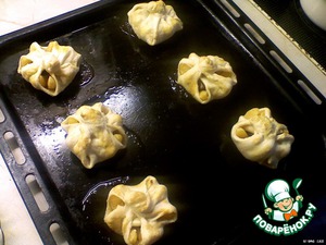 Противень смазать маргарином, положить на него слойки и выпекать в предварительно нагретой духовке до 220 градусов около 20 минут.