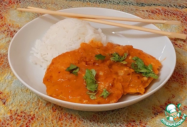 На гарнир подайте отварной рис, украсьте зеленью.