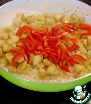Лук почистить, нарезать кубиками, пассеровать на растительном масле пару минут, добавить баклажан и перец, нарезанный полосками.