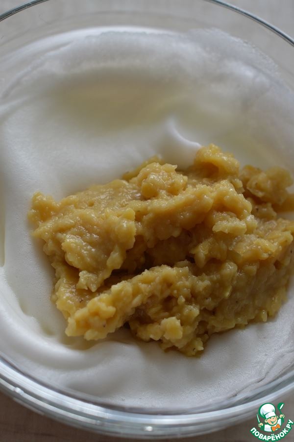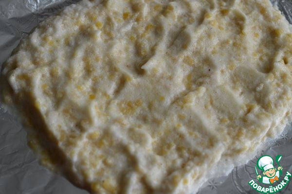 4. Выложить белковую массу на застеленный противень в форме прямоугольника, толщиной примерно 1,0-1,5 см.