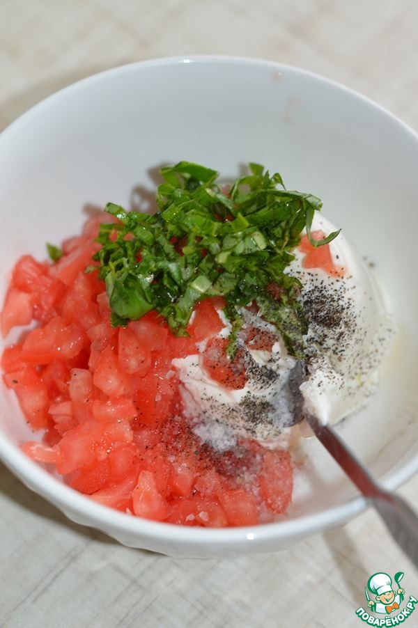 5. Поставить противень в духовку примерно на 15-20 минут. Сверху наше "безе" слегка подрумянится. Помидор очистить от кожуры и семян, нарезать мелко, базилик нарезать. Сыр смешать с помидором, базиликом. посолить и поперчить по вкусу.