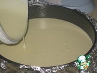 Чизкейк готовится на водяной бане. Поэтому укутываем форму двойным слоем фольги во избежания попадания воды во внутрь. Выливаем полученную сырную массу в форму. |